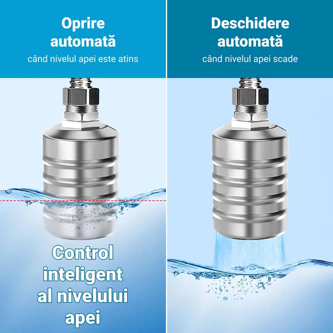 - Valvă Inteligentă și Autoreglabilă – Utilizează presiunea apei pentru a detecta și menține nivelul optim.