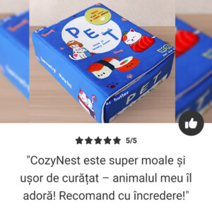 "Câinele meu adoră patul CozyNest! Este moale, ușor de curățat, iar baza antiderapantă îl menține pe loc. Îl recomand cu căldură tuturor proprietarilor de animale!"