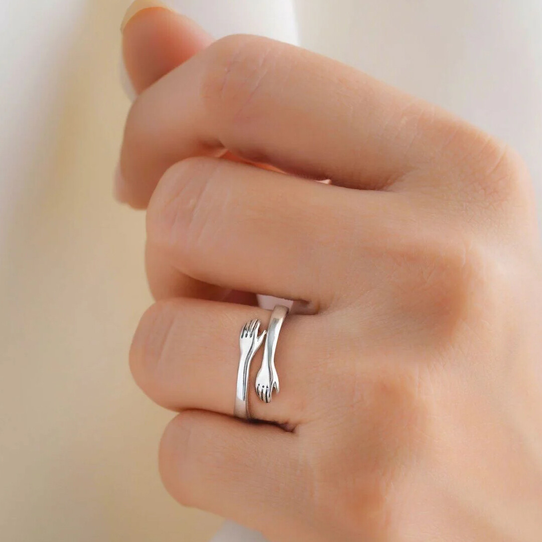 Inelul Abbraccio JEWELITY® simbolizează magnific două mâini care se strâng, reprezentând căldură, dragoste și conexiune emoțională.