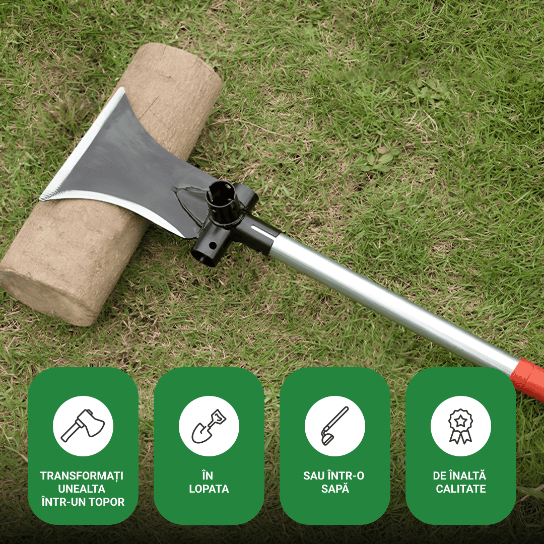 Prin simpla ajustare a poziției mânerului, se poate transforma într-un topor, sapă, seceră sau lopată.