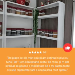 ,,Îmi place modul în care aceste rafturi ale organizatorului schimbă total aspectul spațiul. Sunt foarte robuste și au materiale durabile. Bucataria mea este foarte mica si acest produs mi-a permis sa creez spatiu. Ca urmare, am eliberat un întreg raft și acum am mai mult spațiu.”