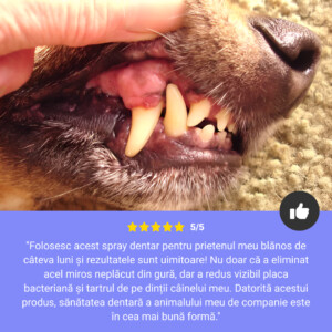 "DentalPaws este un salvator! Câinele meu ura să-i periez dinții, dar acum, cu doar câteva pulverizări, respirația lui miroase proaspăt și dinții lui arată mai curați. Mi-aș fi dorit să fi descoperit acest produs mai devreme!"