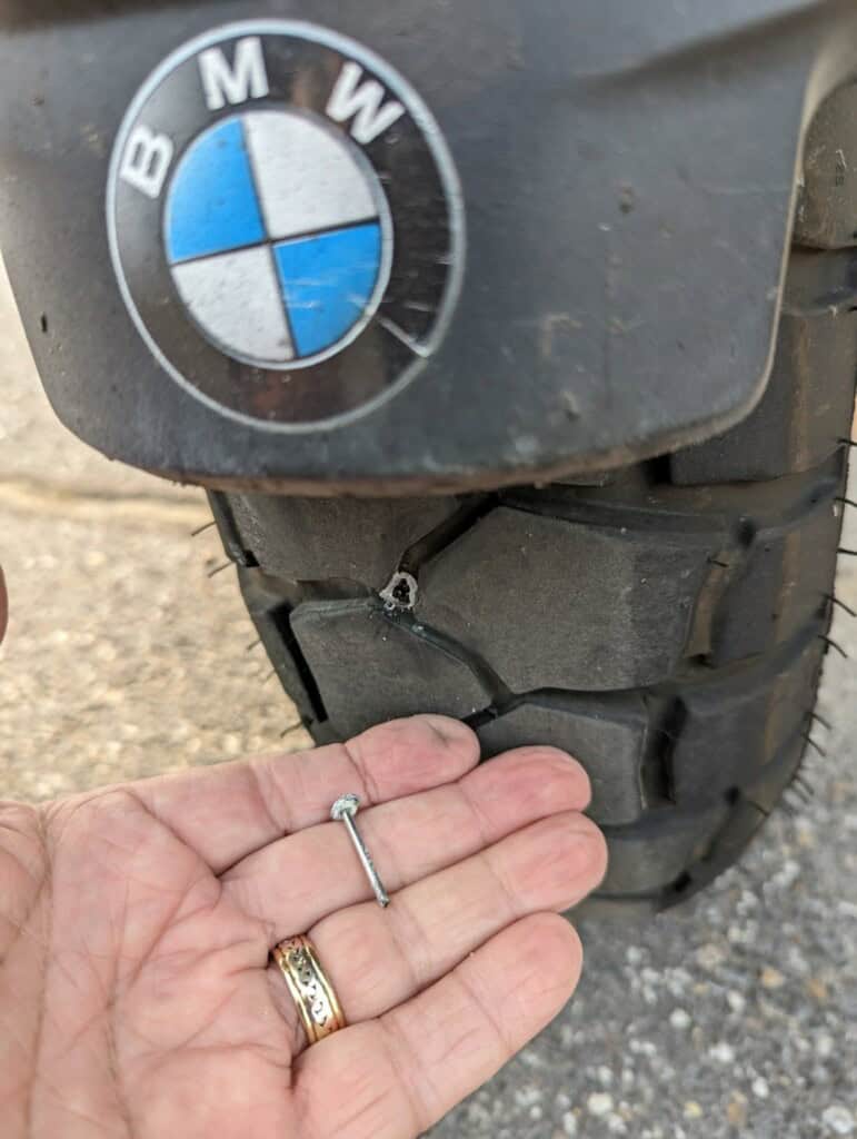 Am găsit un cui în anvelopa din spate a BMW-ului meu 1200GS. Când am oprit ca să mă uit, și am observat că scăpa aer. Am fost într-o călătorie lungă și mi-am amintit că am cumpărat aceste cuie de reparare a anvelopelor cu luni în urmă. Aveam clești, o șurubelniță Phillips, o pompă și un cui din acesta (Am folosit unul mare). Am scos cuiul și a ieșit mult aer. Am înșurubat cuiul de reparații și l-am lăsat să stea timp de aproximativ o oră. Apoi am condus acasă aproximativ 200 de kilometrii, pe autostradă cu 75-80 km/h , iar cuiul de reparații a ținut bine și anvelopa nu a mai scăpat aer.