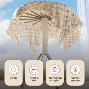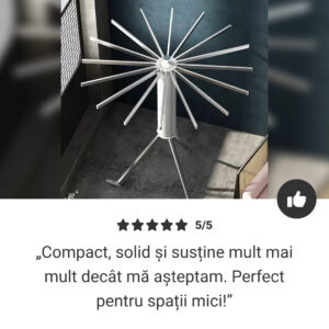 Acest uscător de rufe este o revoluție! Ocupă foarte puțin spațiu când este închis și susține multe haine. Rotirea la 360° este foarte comodă și destul de robustă pentru articole grele. Foarte recomandat.